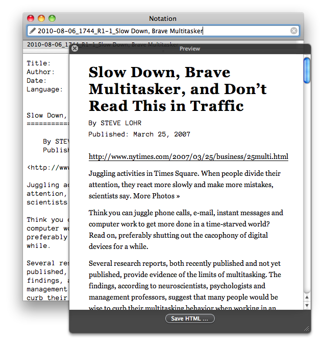 Since early 2010 a new fork of Notational Velocity is available. In September 2010, I just hacked together a quick implementation of MultiMarkdown support for Notational Velocity. Since my digital archive (Zettelkasten) relies on MultiMarkdown syntax, my own need for such a tool huge. The current version sports support for the three most-popular markup languages I know.